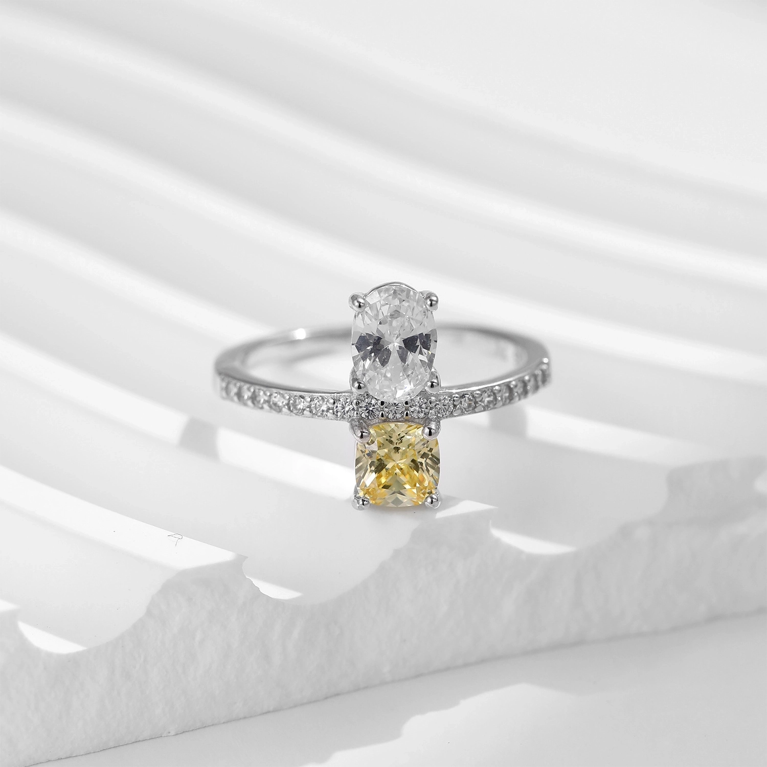 Brilliant twin stars, shining personality: 925 silver 5*5mm pillow-shaped zircon two-color design engagement ring