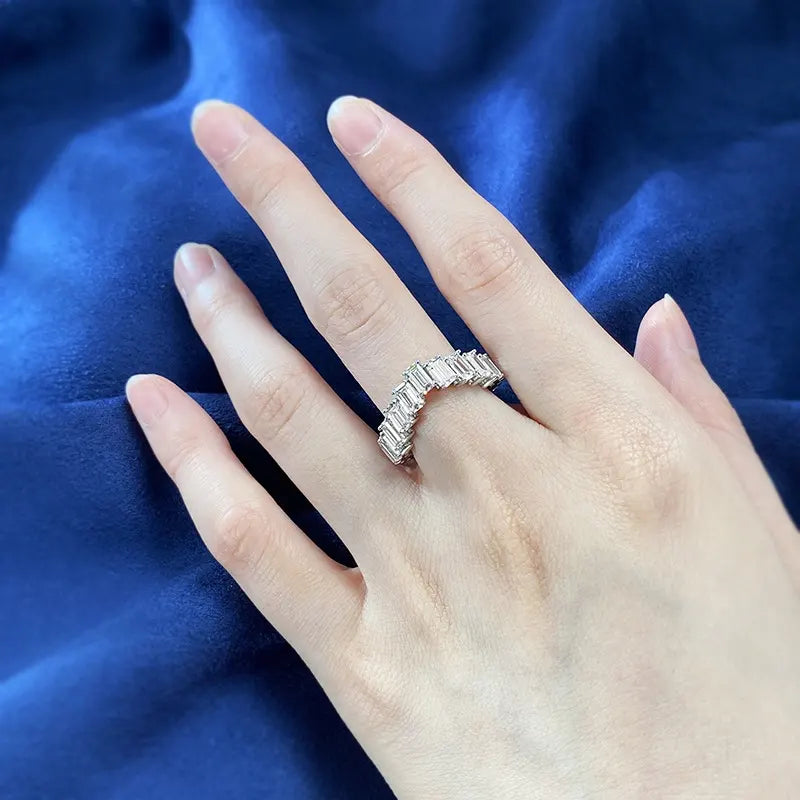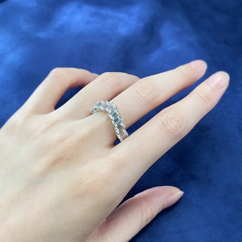 This 3*5mm Emerald Cut S925 Silver High Carbon Diamond Full Diamond Engagement Ring perfectly combines classic and modern. The unique diamond row design is like a galaxy, exuding charming brilliance. The emerald cut high carbon diamond in the center is exquisitely cut and full of fire, like the stars in the night sky, exuding charming brilliance. The surrounding pavé diamonds are like galaxies, making the main stone in the center more eye-catching. The ring body is made of S925 silver, with smooth lines, simple and atmospheric, highlighting the wearer's elegant temperament.