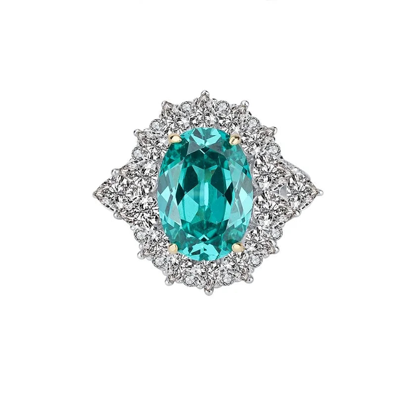 This 10*14mm oval double-layer halo S925 silver Paraiba tourmaline green commitment engagement diamond ring, with the classic oval-cut Paraiba tourmaline as the protagonist, with a unique double-layer halo design, interprets a romantic and beautiful love ode. Every detail shows the sense of design and taste, and it is an excellent choice for women who pursue light luxury temperament.