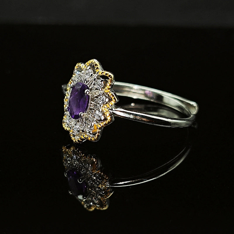 This ring is made of 925 silver, with an oval amethyst as the main stone and high-carbon diamonds. The overall design is noble and elegant. Amethyst symbolizes tranquility and wisdom, and the ice flower cutting process makes it exude charming brilliance. Whether it is worn daily or on special occasions, this ring can add a unique charm to you and become a classic choice in your jewelry box.