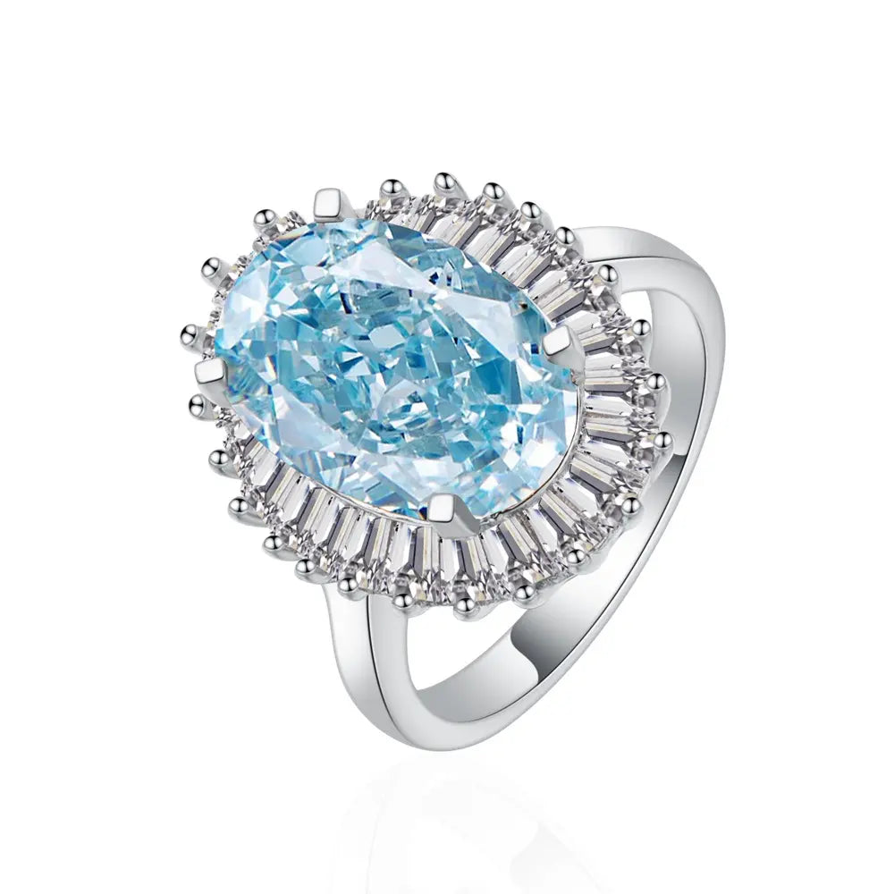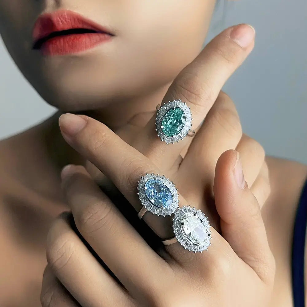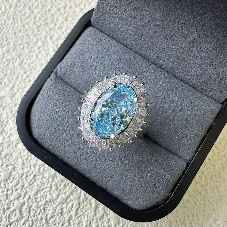 A masterpiece of design, this ring is expertly crafted in 925 silver and set with luxurious claws. The intricate design of the surrounding diamonds is reminiscent of the delicate stars twinkling in the night sky, adding a touch of nobility and exclusivity to this piece. Every facet of the oval high carbon diamond is polished to perfection by our skilled artisans, whose passion is reflected in the diamond's radiance.