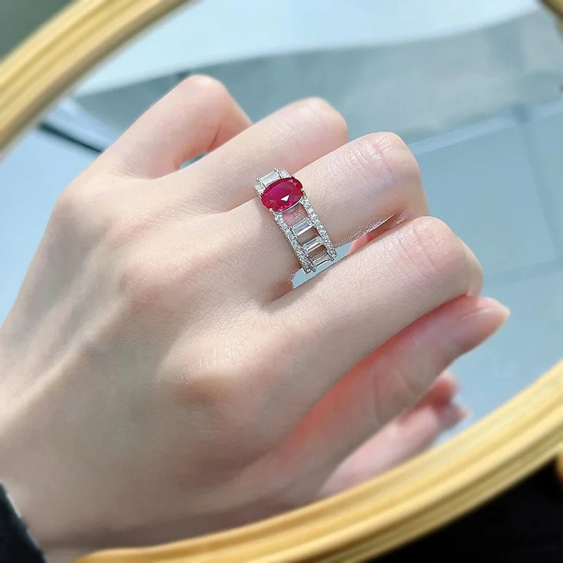 This 6*8 oval ruby high carbon diamond 925 silver engagement ring is not only a piece of jewelry, but also a work of art. It perfectly combines romance, simplicity and fashion, and is the best choice for women who pursue high-quality life.