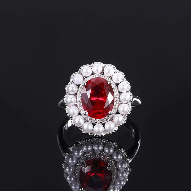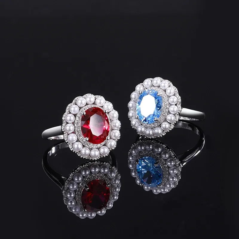 Order your 8*10mm Oval Pearl Halo S925 Silver High Carbon Diamond Ruby Aquamarine Promise Engagement Diamond Ring now and start your fairy tale love story