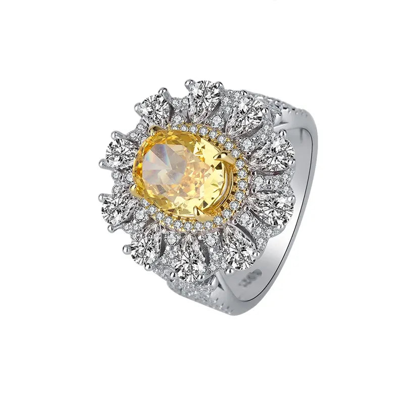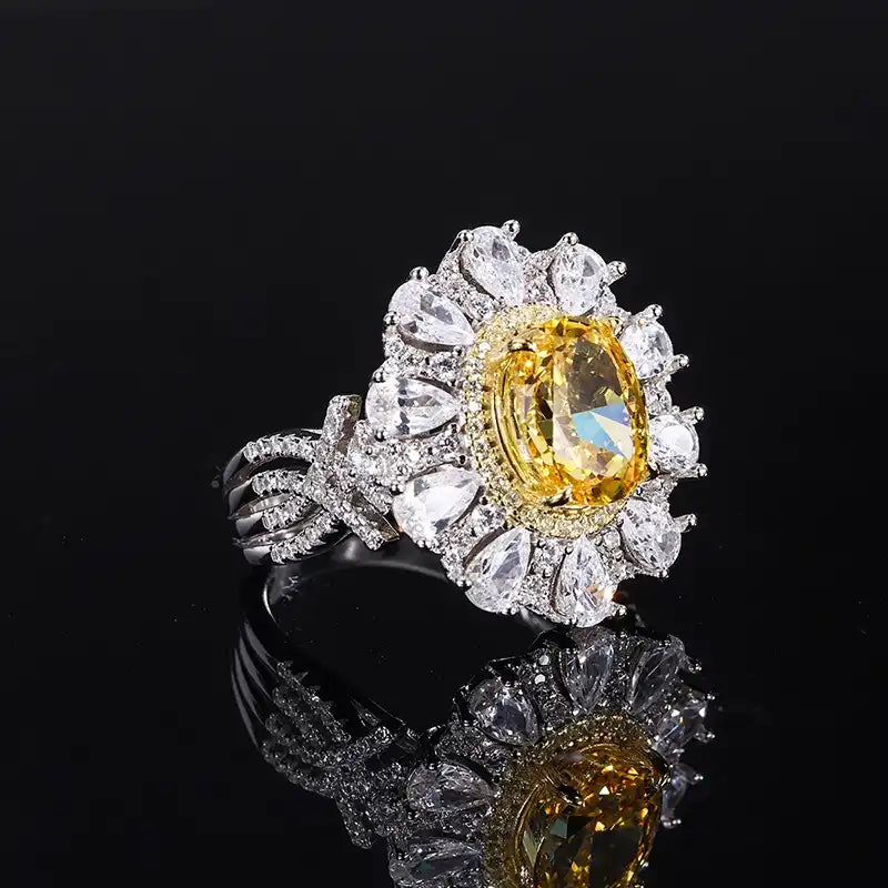 Order your 8*10mm oval S925 silver yellow high carbon diamond floral design claw setting commitment engagement ring now and start your fairytale love story