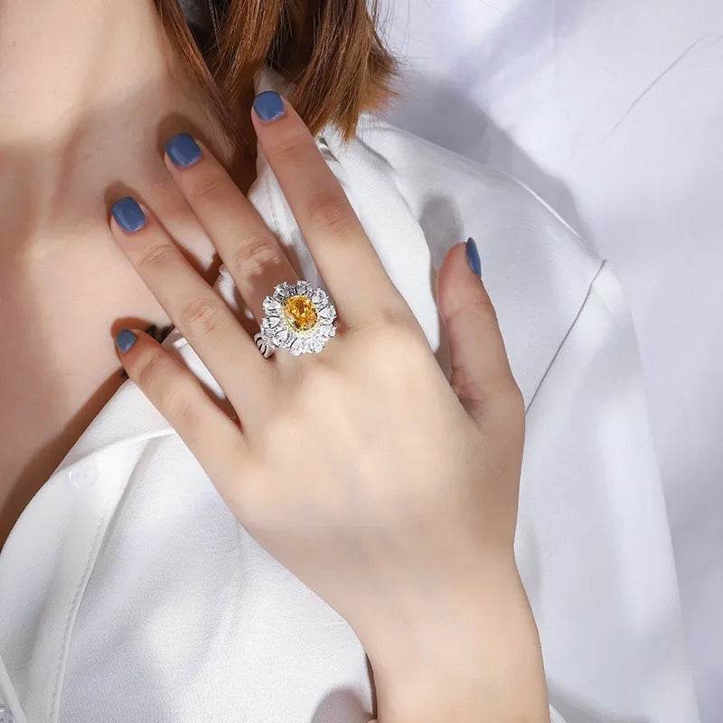 This charming 8*10mm oval S925 silver yellow high carbon diamond floral design claw setting commitment engagement ring will start a new chapter in your love story. Its charming design, excellent craftsmanship and luxurious setting will amaze her. Order it today and make your proposal a moment she will cherish forever.