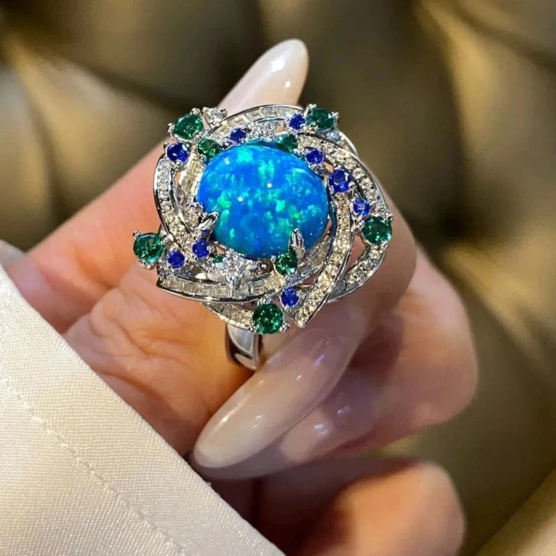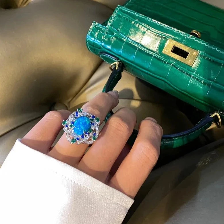 This oval engagement ring is mainly designed in flower shape. The perfect combination of 925 silver and high carbon diamonds outlines a beautiful picture. The main stone is like a dream, and the surrounding gorgeous green and blue diamonds symbolize pure and eternal love, making your every day full of romance.