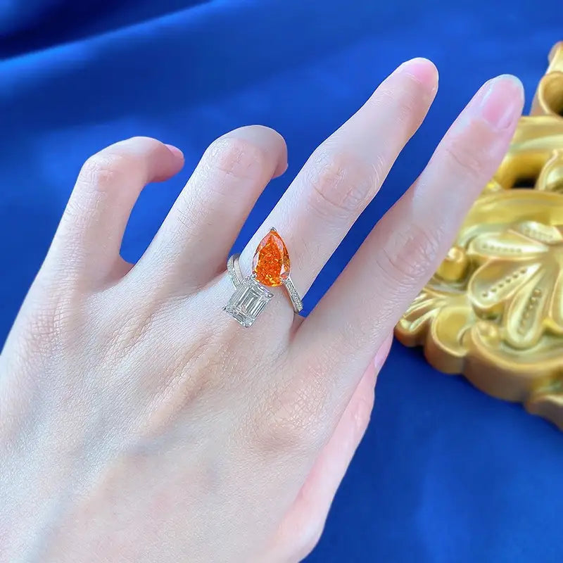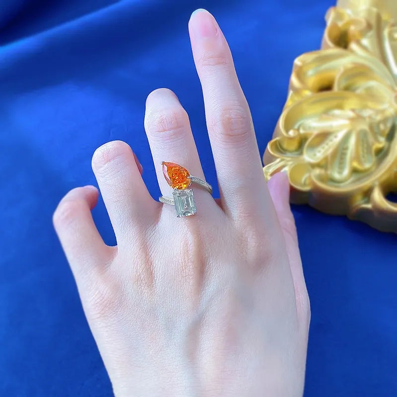 This 8*12 pear-shaped orange high-carbon diamond 925 silver engagement ring is not only a piece of jewelry, but also a work of art. It perfectly combines passion, personality and classics, and is the best choice for women who pursue a high-quality life.