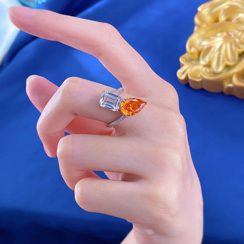 Kiss of Flame: 8*12 pear-shaped orange high-carbon diamond 925 silver engagement ring, igniting the passion of fingertips
