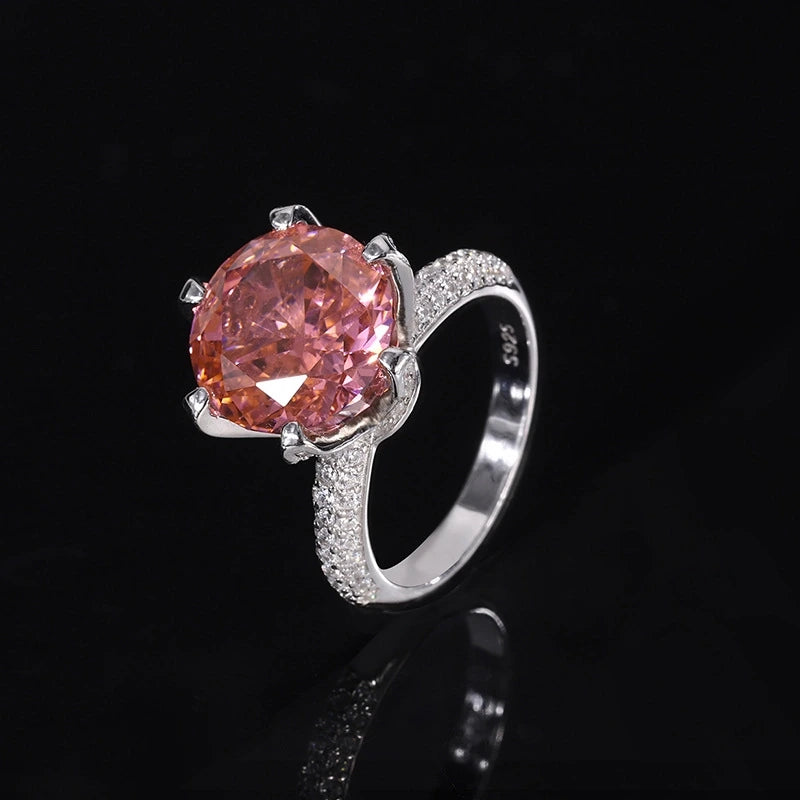 12mm round S925 silver pink high carbon diamond full diamond claw set promise engagement ring, this is a work of art that perfectly combines classic and modern. The round main stone in the center is like a shining gem, exuding charming light. The diamonds surrounding the main stone are like stars, outlining an elegant curve, which is more noble.