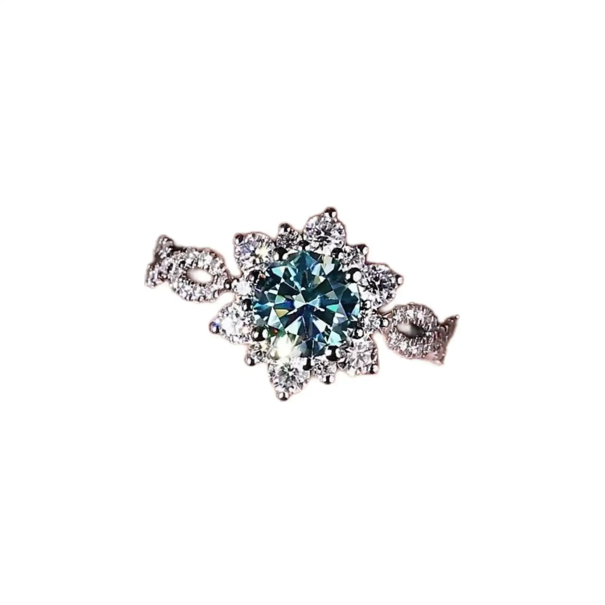 The designer draws inspiration from blooming flowers and designs the ring into a blooming flower. The cyan moissanite in the center is like a pistil, exuding charming brilliance; the small diamonds around it are like petals, light and agile, together sketching a romantic and beautiful picture.